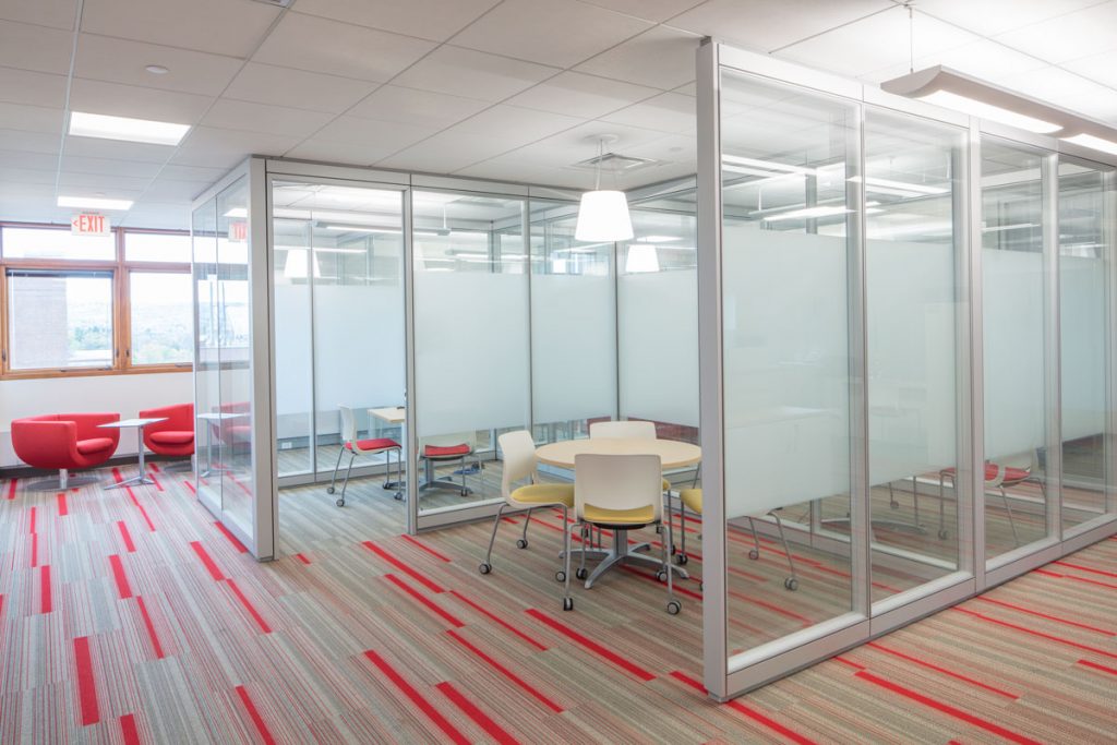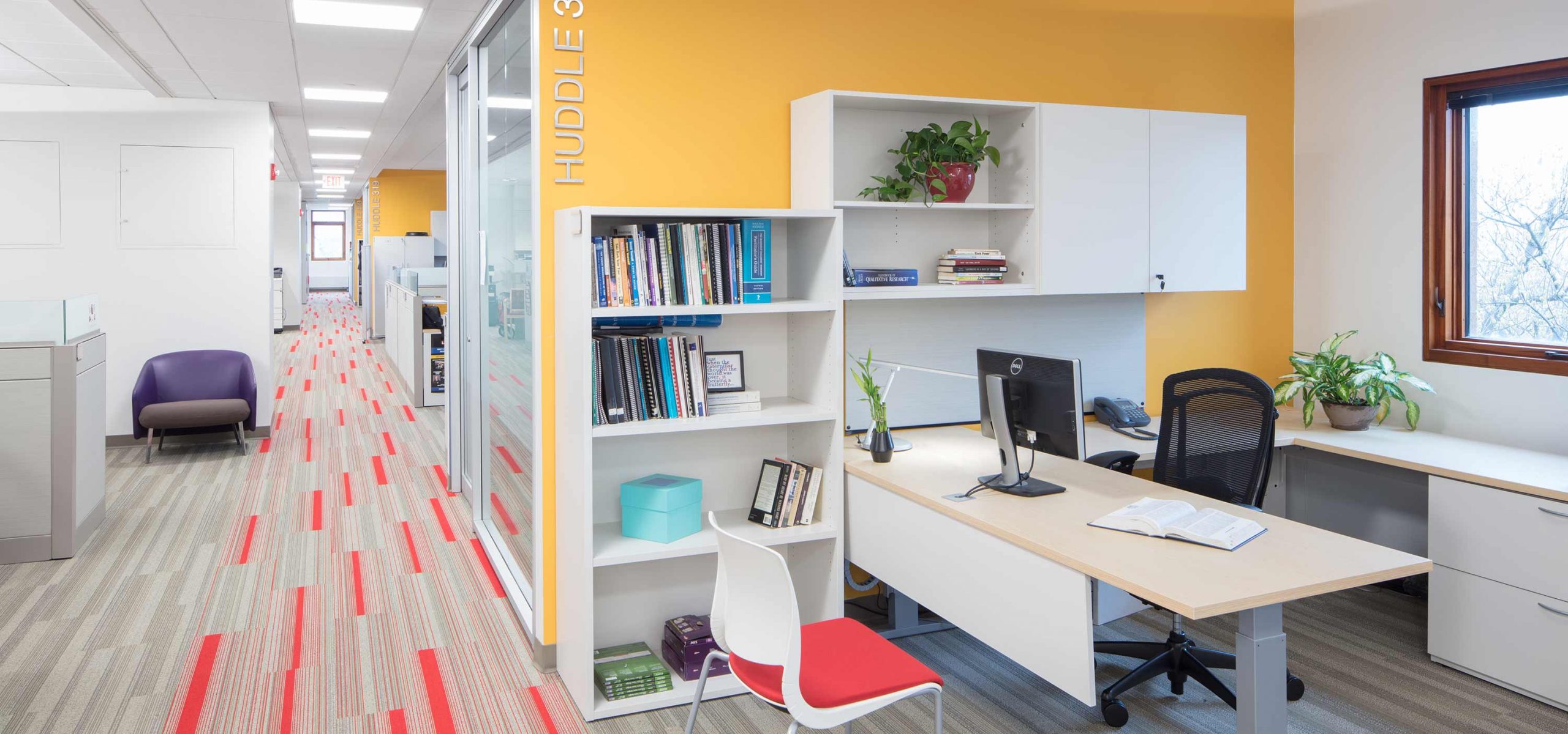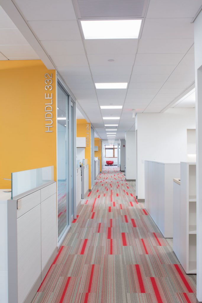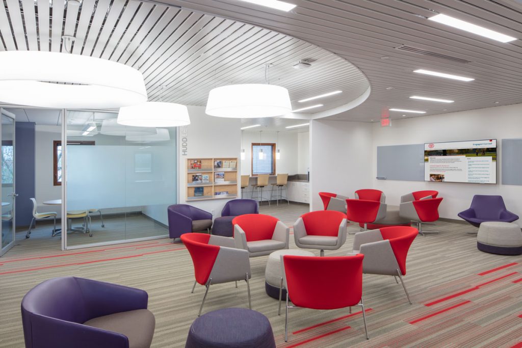 As a result, the final design solution eliminated costly redundancies including a completely enclosed interior core zone and the majority of private offices. The space was transformed into an open-office environment with private, shared, and collaborative huddle-rooms interspersed throughout. The conversion introduced natural light, which benefits every occupant, and flexibility with multiple, shared spaces and support areas. At the entrance, a “living room” with comfortable furniture provides opportunities for multi-media presentations attracting both students and visitors. The resulting collocated space offers collective resources, fosters collaboration among engagement units, and provides students, community partners, and the campus with a supportive experience and central meeting place.
