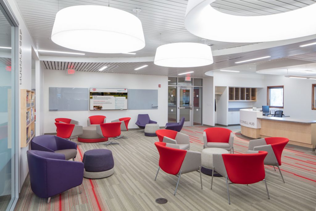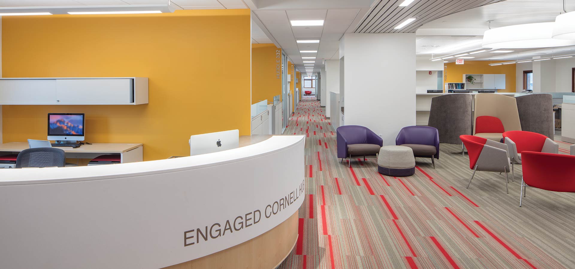 Chiang | O’Brien Architects was selected to create a new hub in Kennedy Hall to advance Cornell University’s mission of community-engaged discovery and learning. The initiative involved nine groups, including Engaged Cornell, Engaged Learning + Research, and the Public Service Center, and required a thoughtful navigation of the diverse politics, viewpoints, and user needs of each group, who were moving from nine distinct locations to create the newly formed Engaged Cornell initiative. Worth noting was the involvement of the nine user groups in an inclusive, community-input meeting coordinated by the design team whereby various iterations of building plan layouts were explored through a participatory-design process.