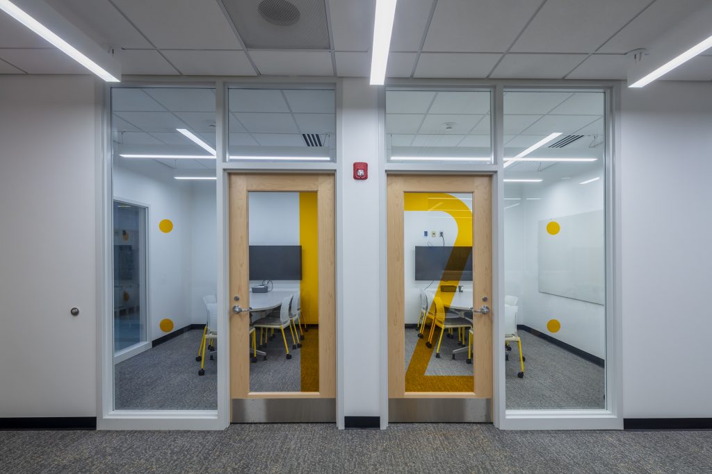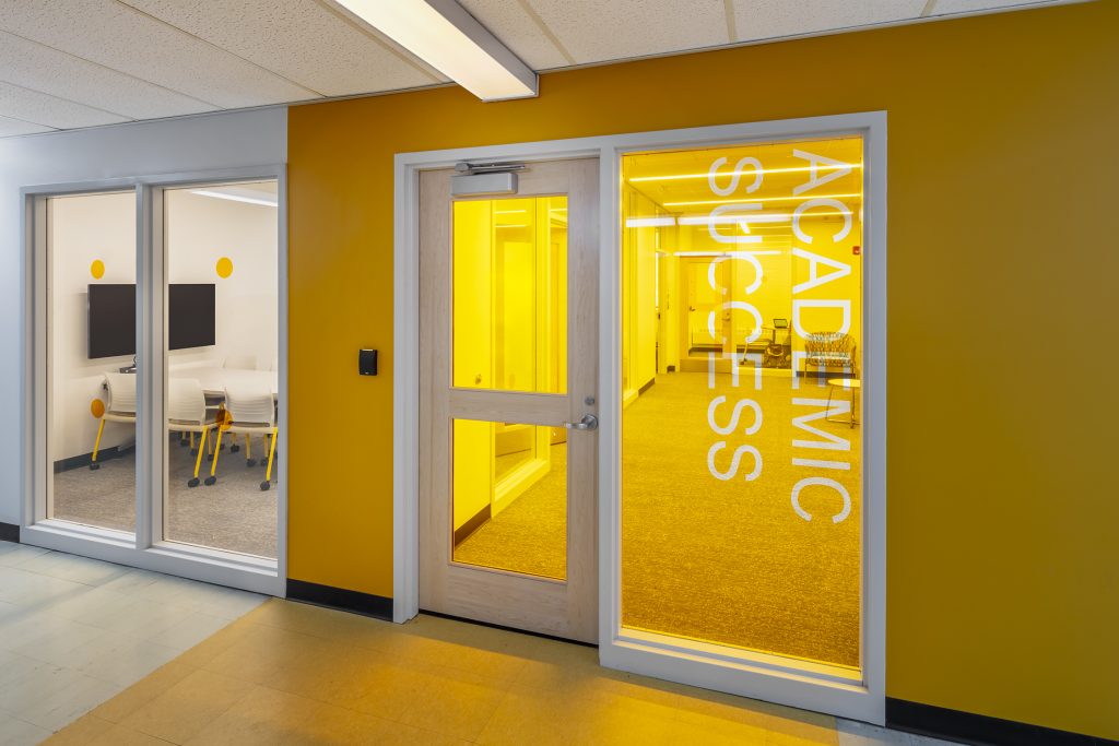 On the lower floor, renovations for a new purpose-built Academic Support Center include tutoring staff offices, four-team rooms for tutoring and group student study, a student lounge, and a conference room for the staff.
