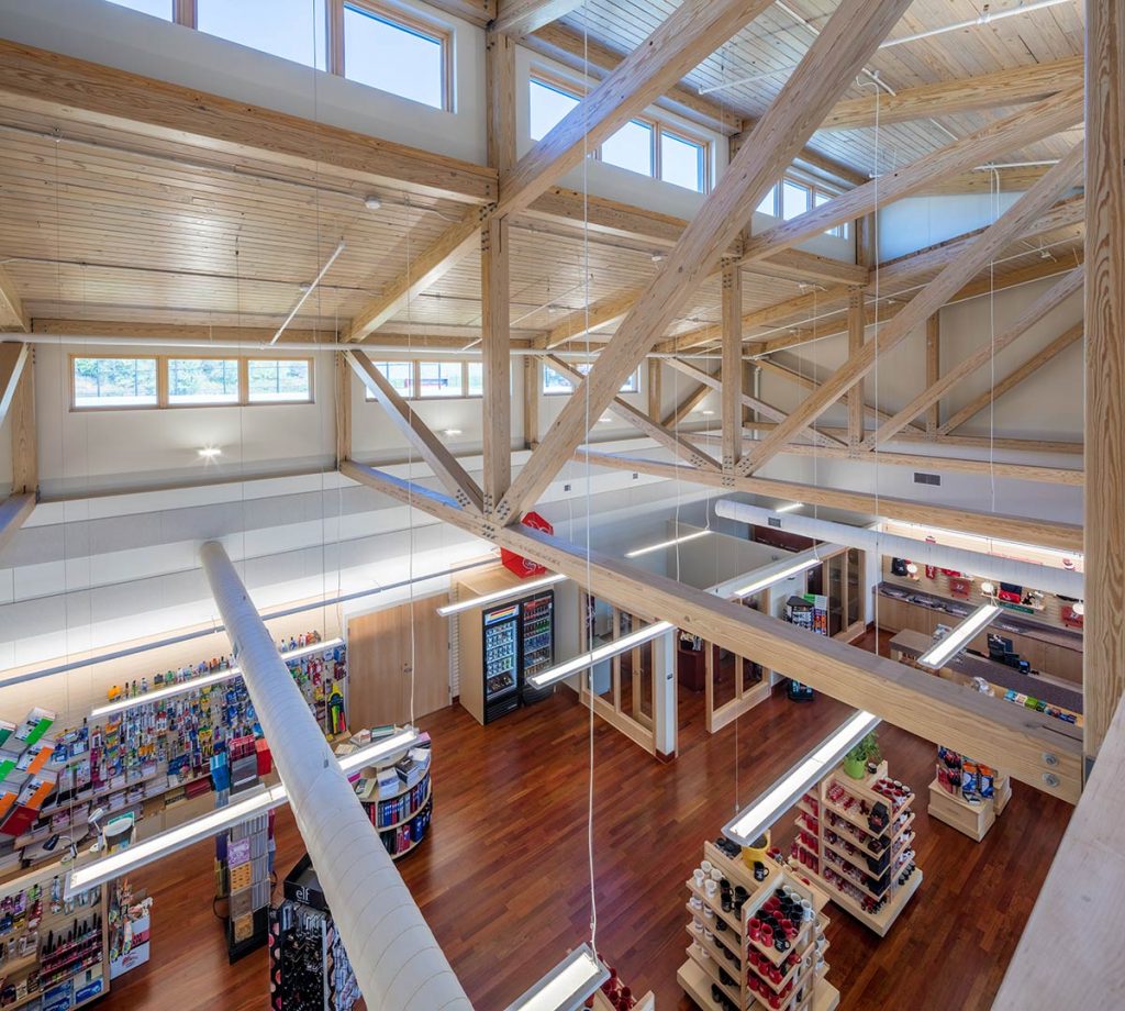 Pitched roofs framed with glue-laminated timber trusses form clerestories and dormers that flood the interior spaces with natural daylight. The building transitions to a terraced green roof with direct access from the second floor that provides essential visual interest for the office spaces on the second floor—a foreground view of the sedum roofscape and views of the athletic fields beyond.