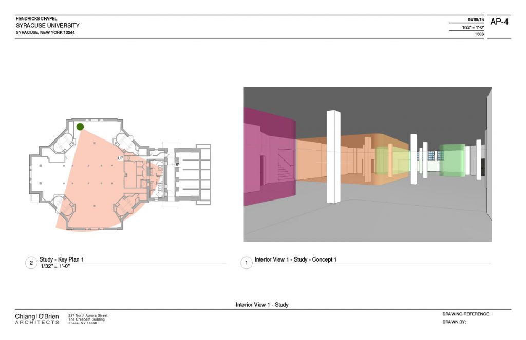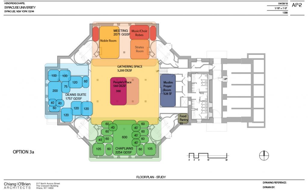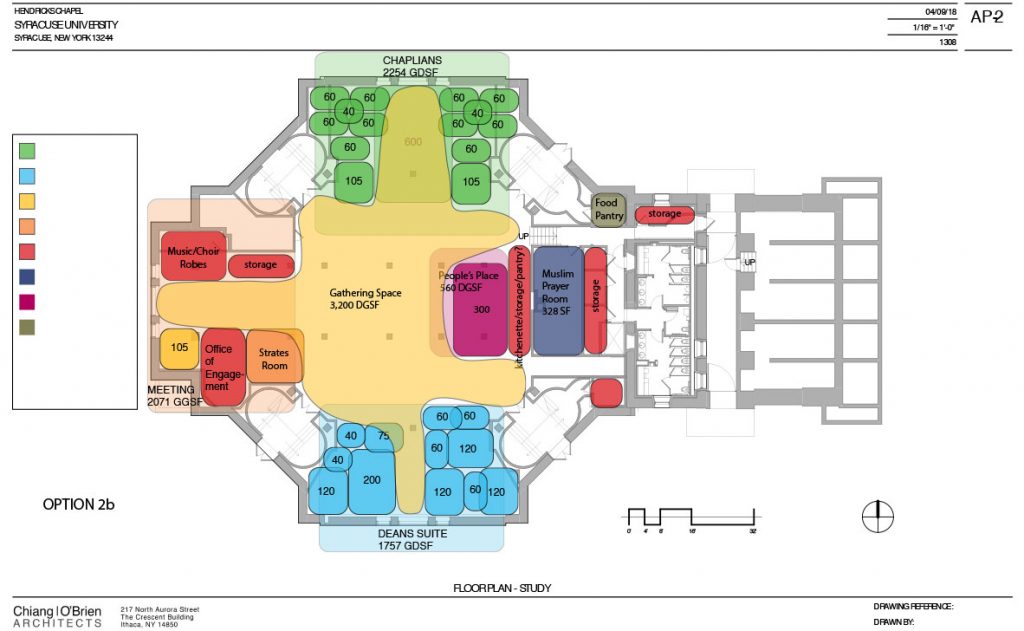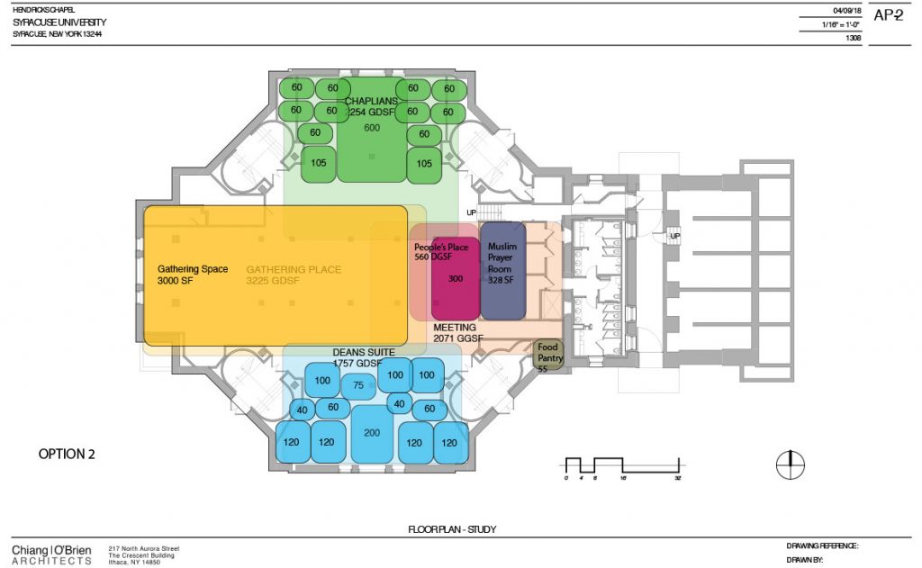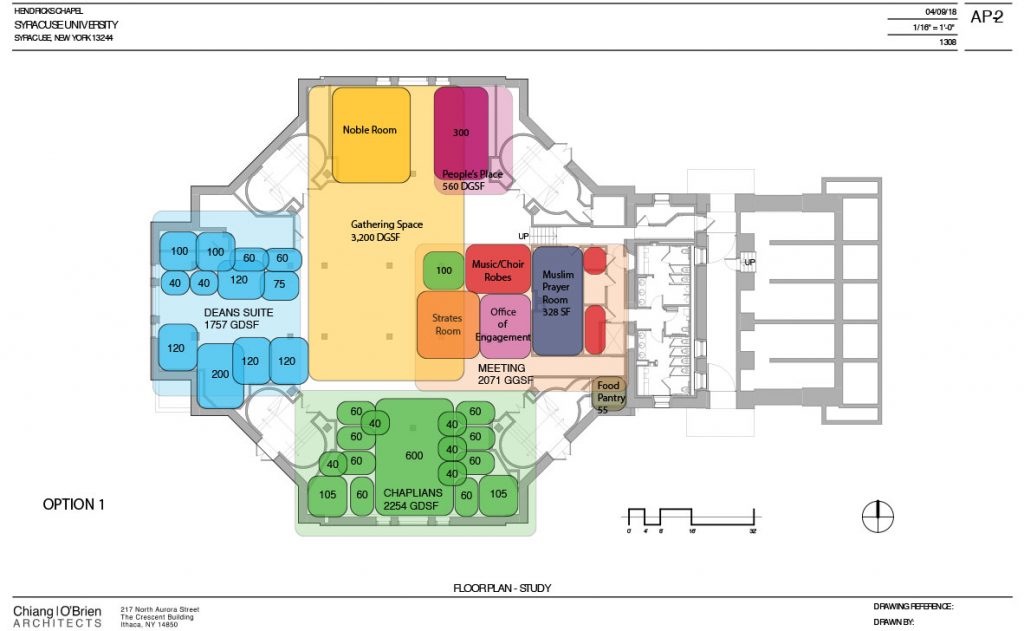 The iconic circa 1930 Hendricks Chapel stands at the heart of campus, on the main university quadrangle, is planning for a transformative renovation. Chiang | O’Brien Architects completed a visioning, programming, and concept study for the Hendricks Chapel transformation. Information gathering began with interviews and discussion with the Dean, chaplains, and staff, who provided the guidance needed to develop a tabular and functional program, which was then translated into a graphic diagram that illustrates various programmatic elements. Multiple diagram-level concept plans followed to promote discussion, feedback, and consensus about the best approach.