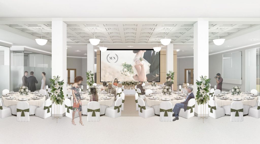 The selected option provides maximum flexibility. These images depict a variety of use, including a coffee shop and formal event space for banquets and lectures. The coffee shop is designed to close up and create a clean backdrop for formal activities. This approach allows for a total transformation of the space. Also, the plan layout and site sketches create an outdoor seating area for the coffee shop customers and other chapel visitors. The study has provided the Dean and university with exciting possibilities that will help to achieve their vision and goals and compelling graphic materials that will support fundraising efforts.
