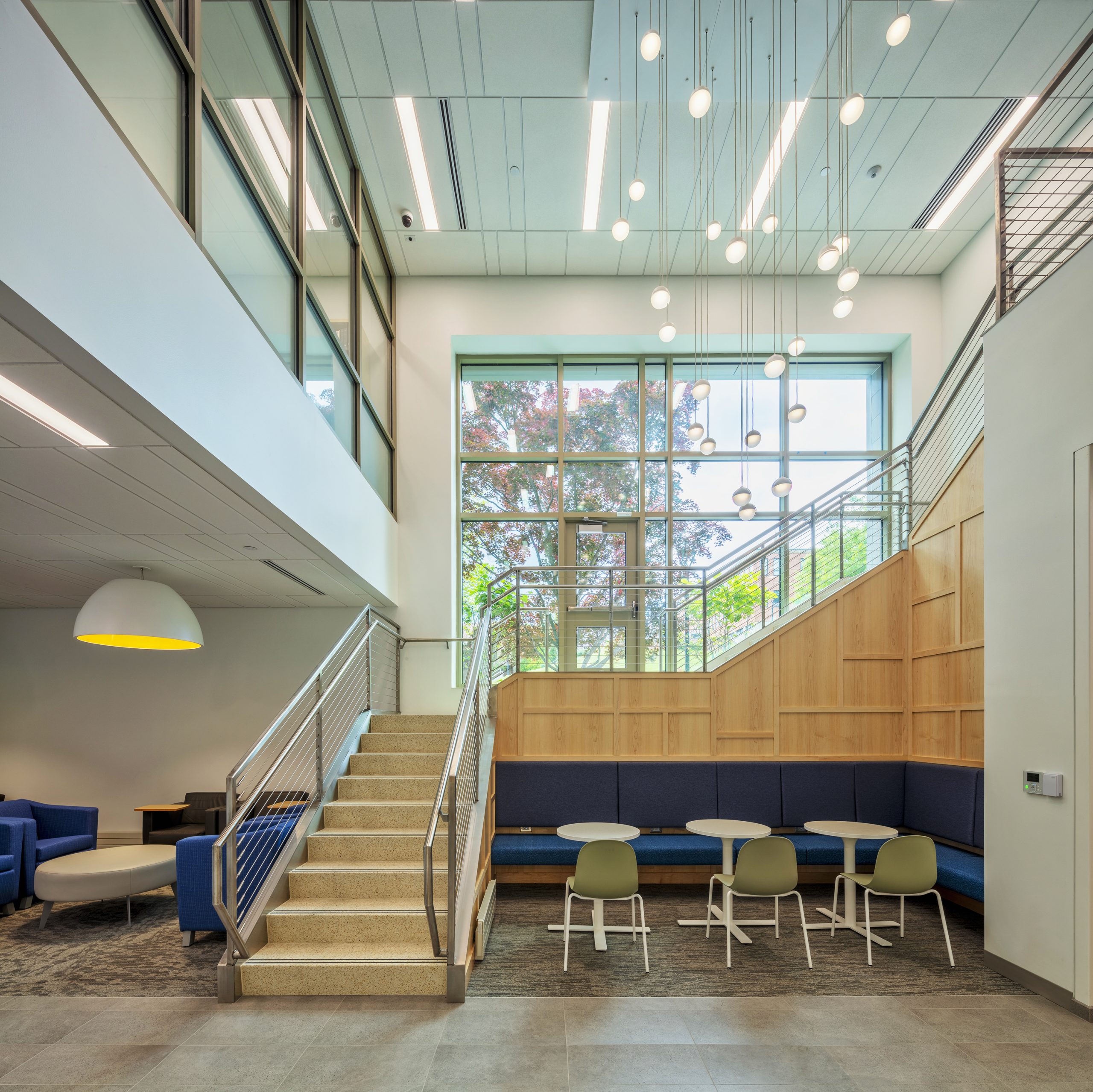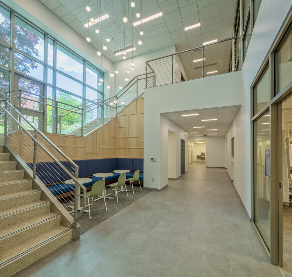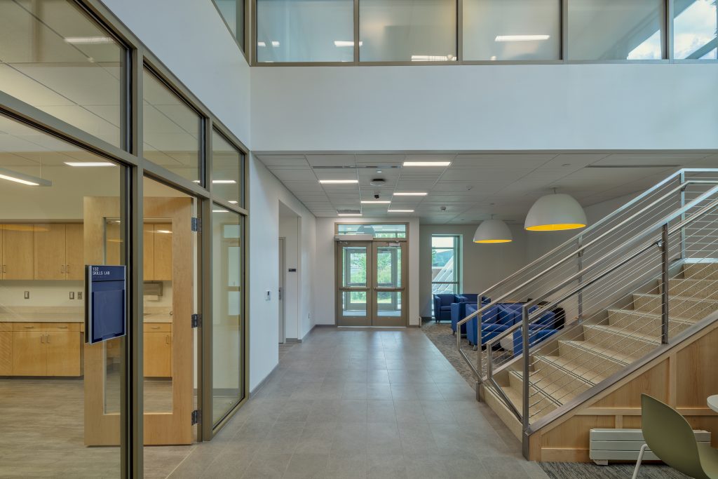 For the nursing program on the first floor, a student lounge is to the left of the newly created north entrance vestibule. A monumental open stair and two-story atrium are visible and directly connect from the first-floor lobby to the second-floor lobby. A secondary student lounge with a built-in bench is inside the U-shaped stair footprint. The built-in bench features a decorative wood paneling backdrop that follows the underside of the stair stringer up to the second floor.