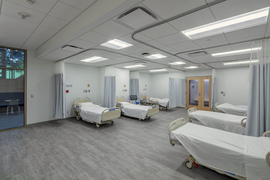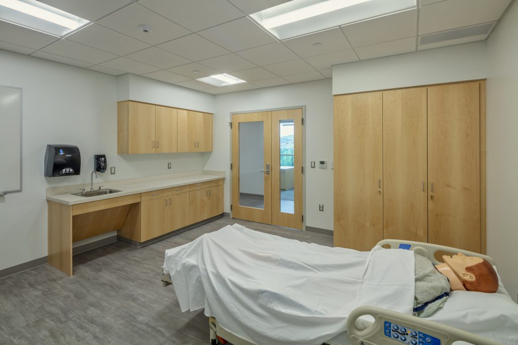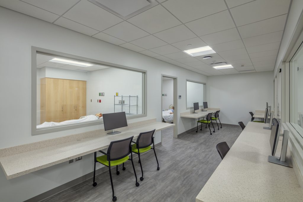 The central core is primarily dedicated to simulation teaching spaces. In this core, the skills lab opens to the first-floor building atrium and lobby. A full-height glazed entrance showcases the nursing teaching space, giving visitors traversing through the building a glimpse into the program offerings—“science on display.” The glazed entrance offers visibility into the skills lab’s meeting area, which has a central table and wall-mounted LCD display screen.