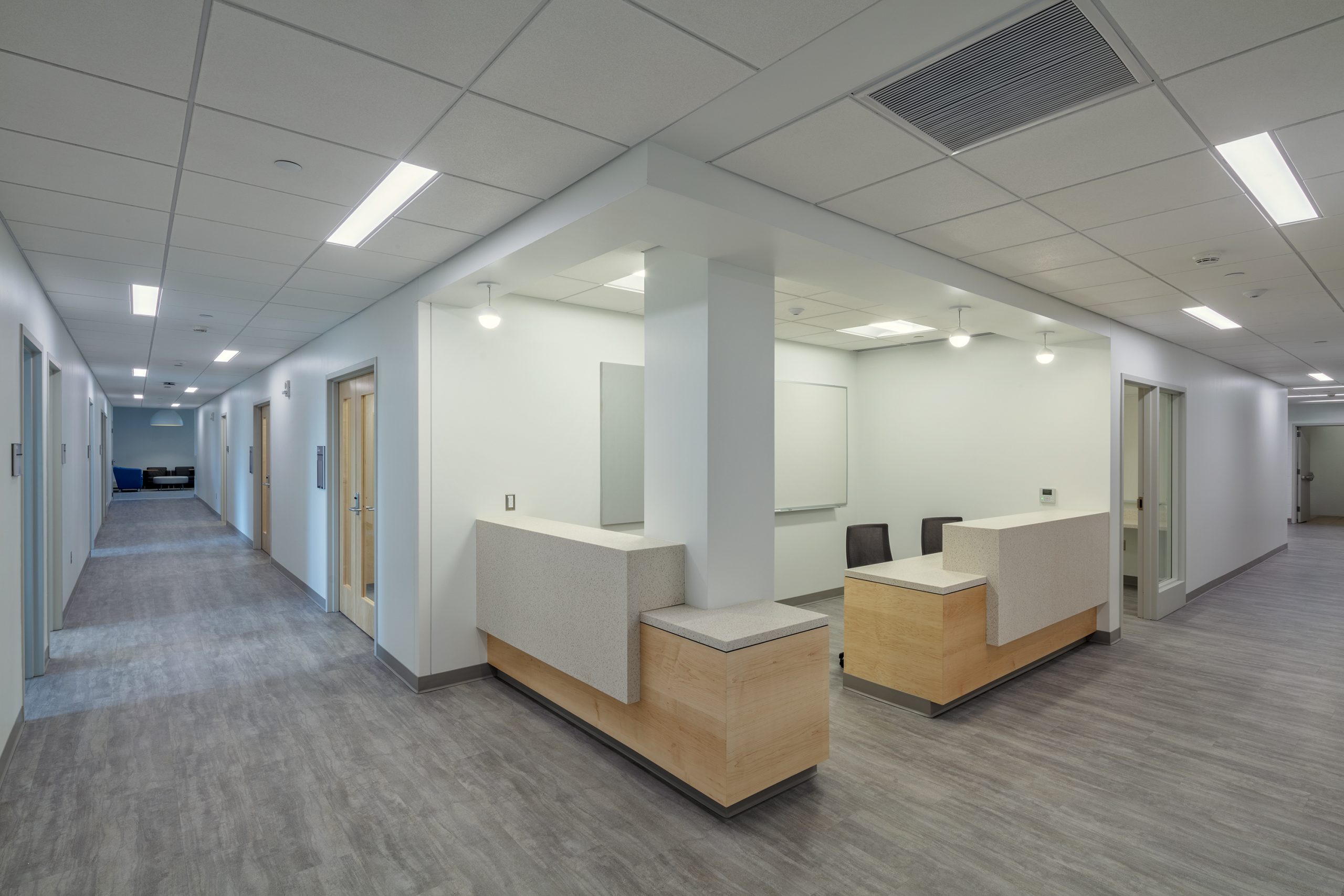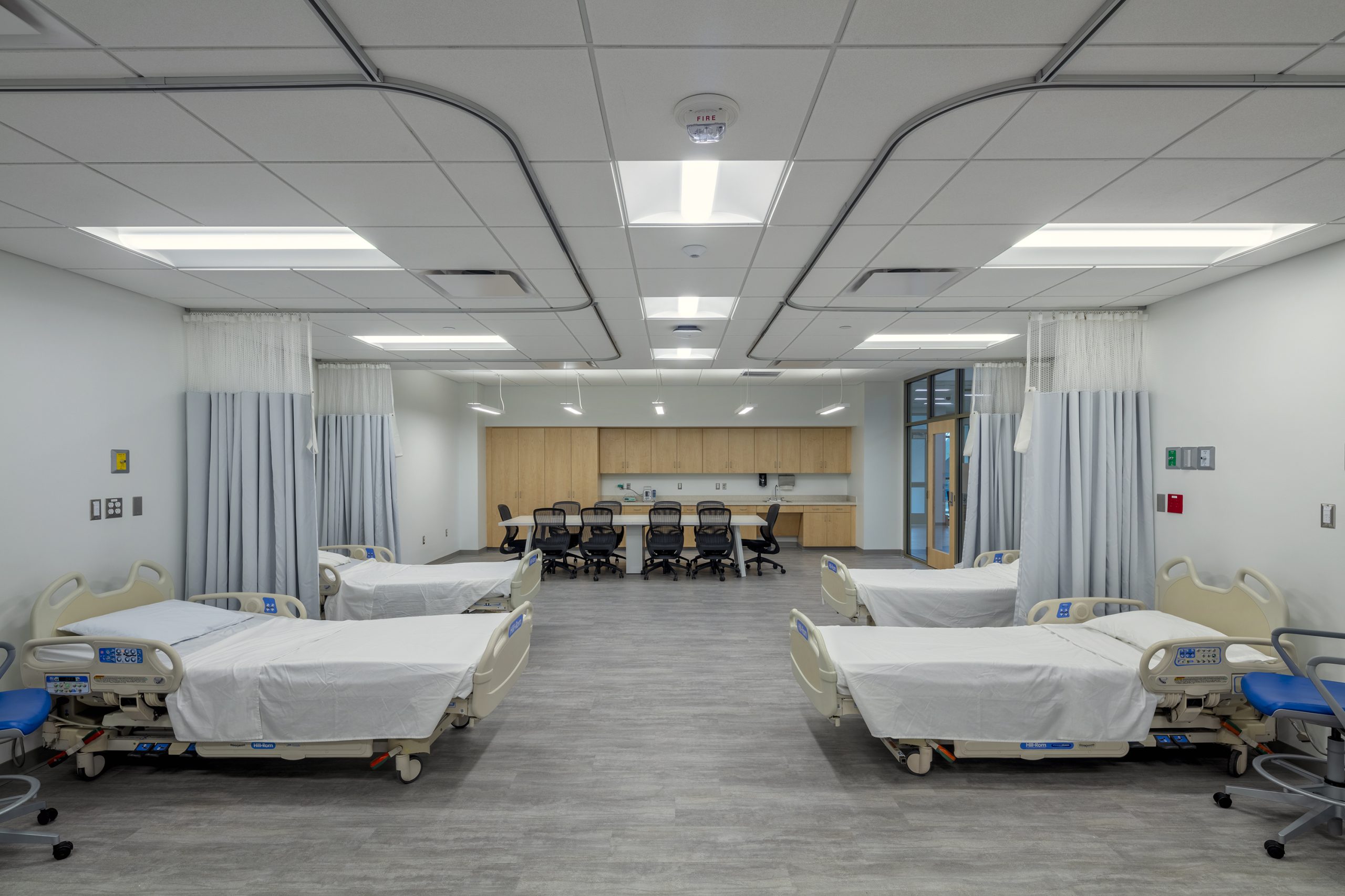 A nurse station at the northwest corner of the racetrack corridor serves as a touchdown space for adjunct faculty and a simulation nurse station. A wall-mounted glass marker board provides a surface for messaging and communications between faculty and students.