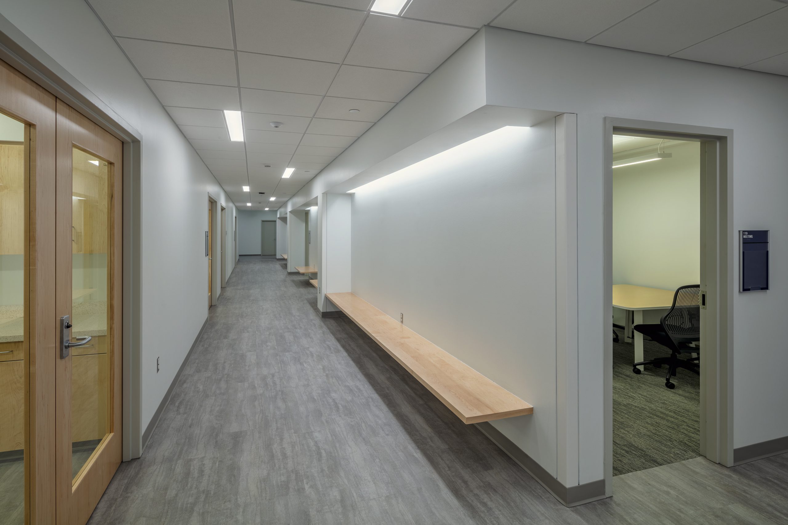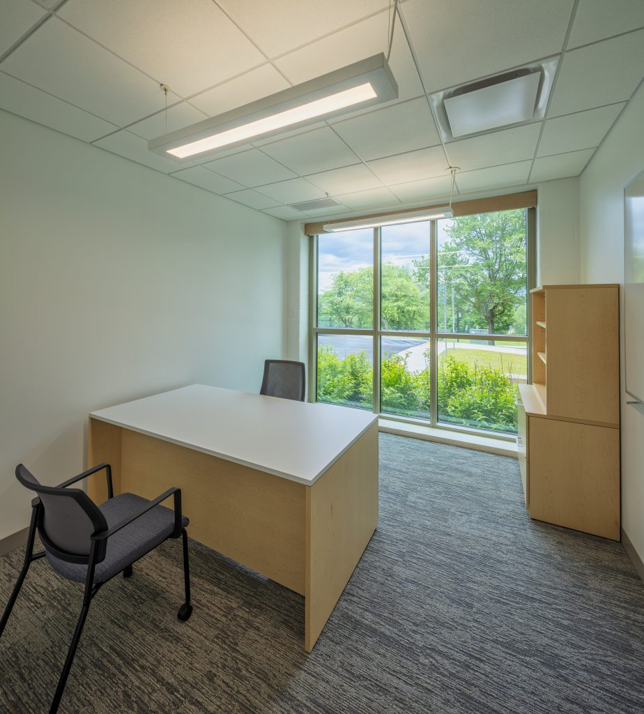 The nursing floor plan features a racetrack circulation configuration with all faculty offices along the north and west corridors and the teaching spaces clustered on the central and south sides. Offices, small meeting rooms, a conference room, and debriefing rooms are located along the south corridor directly across from a SIM Labs and skills lab. The south corridor is student-oriented, providing direct access to many teaching spaces. Benches along this corridor encourage ad-hoc collaboration and give the students much-needed touchdown and study space. It also provides seating for students waiting for class or to speak with faculty.