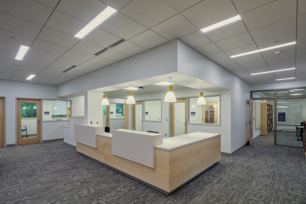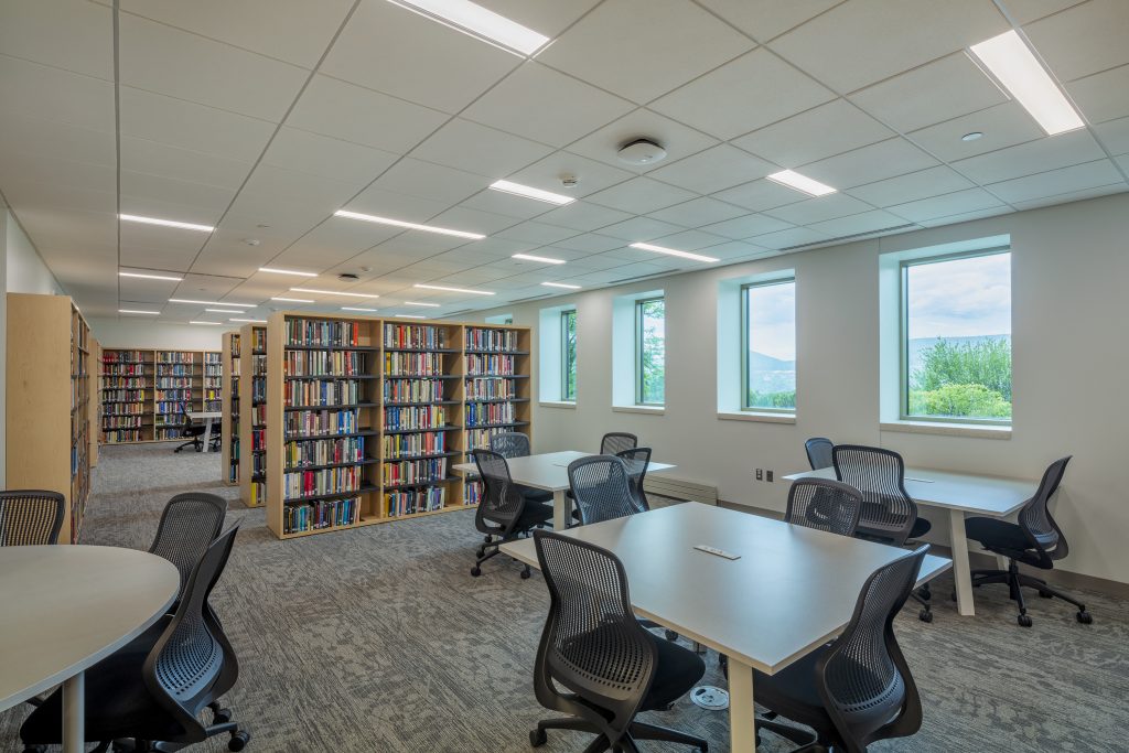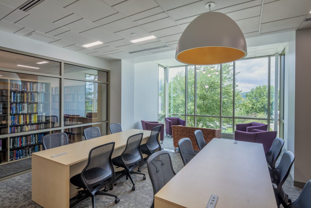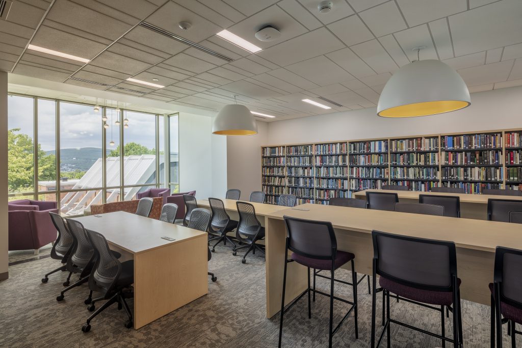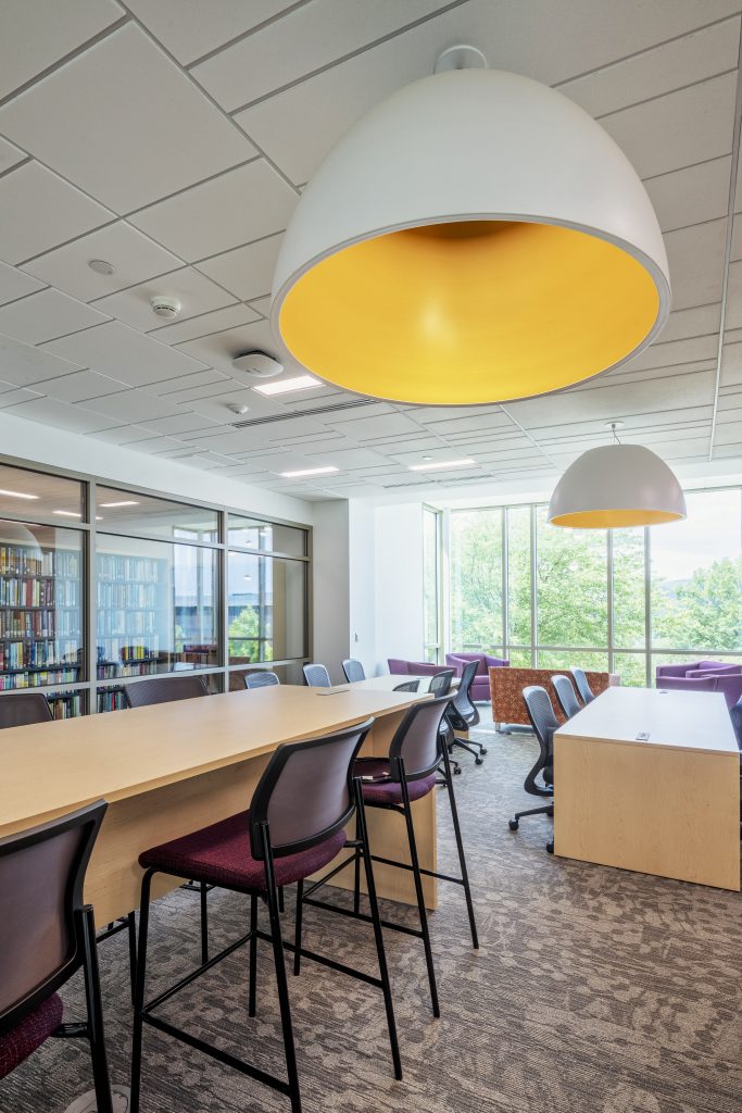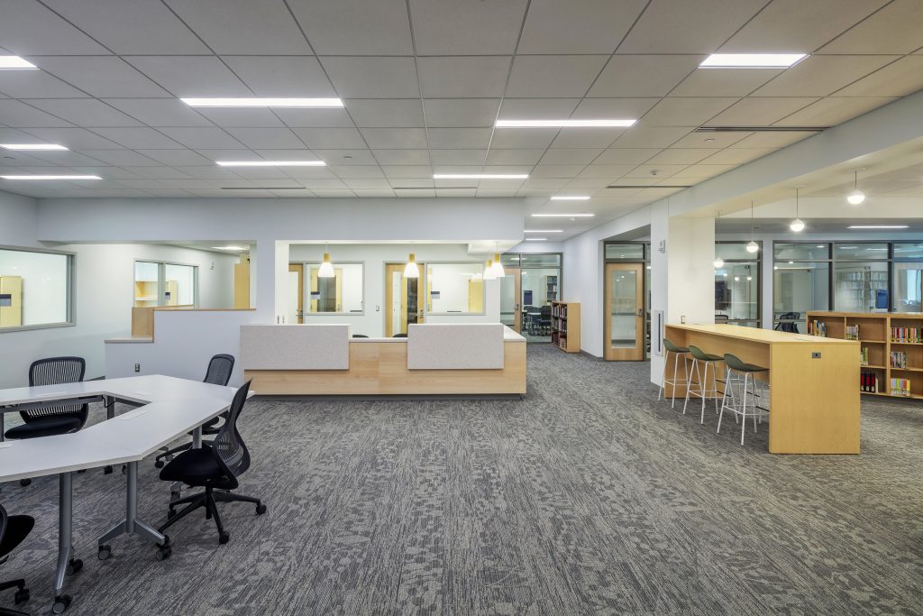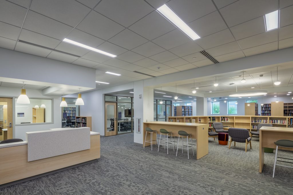 The goal for the Penn State—Scranton library was to create an innovative and collaborative “center for knowledge” that would attract it’s students. The library includes a new main entrance with a fully glazed wall between it and the new main lobby corridor, transparent collaboration rooms, exhibit and display areas, flexible programmatic zones, and new furniture and lighting.