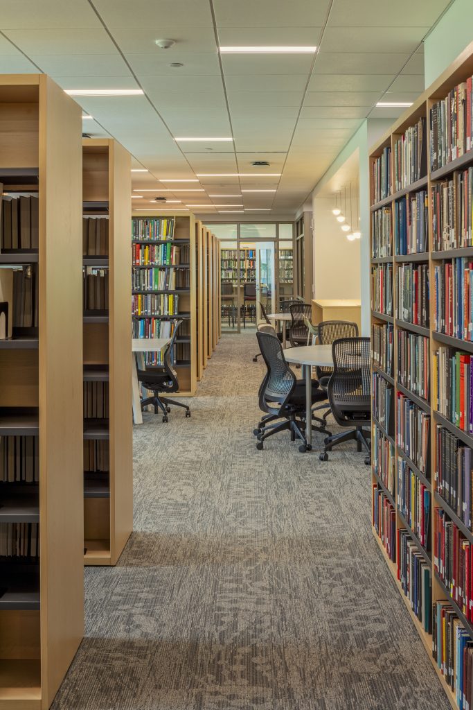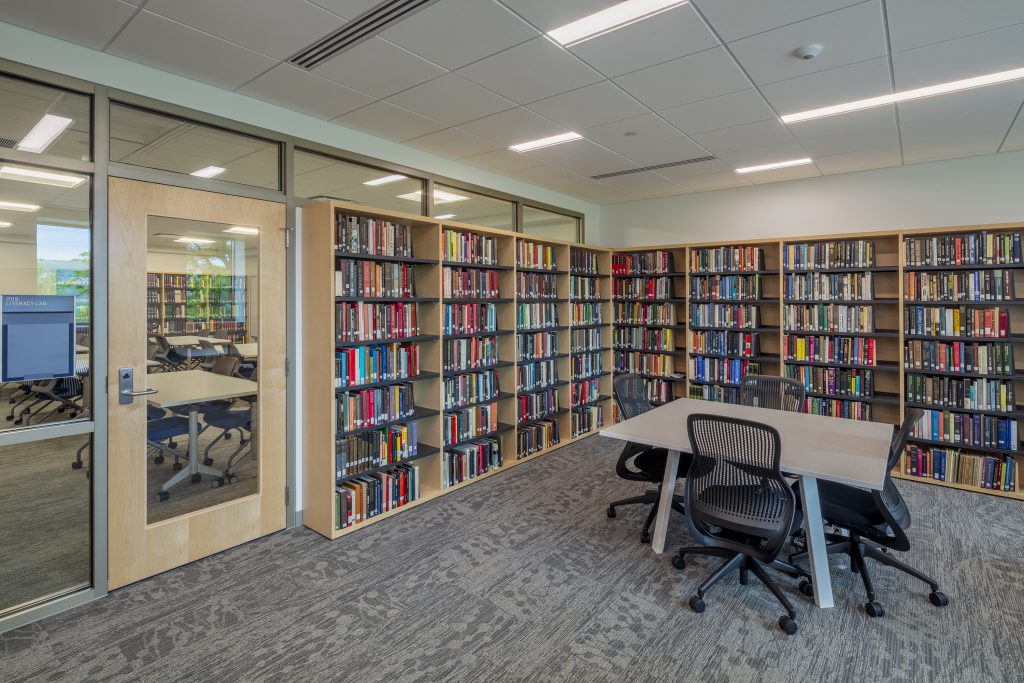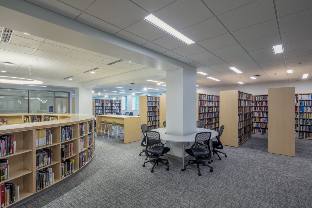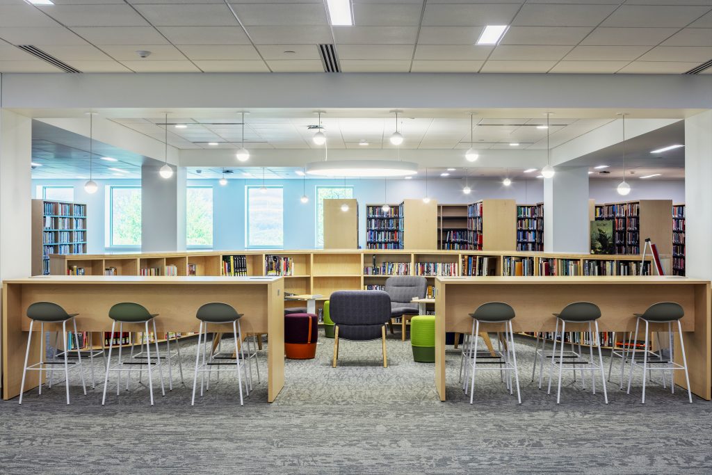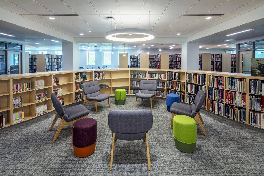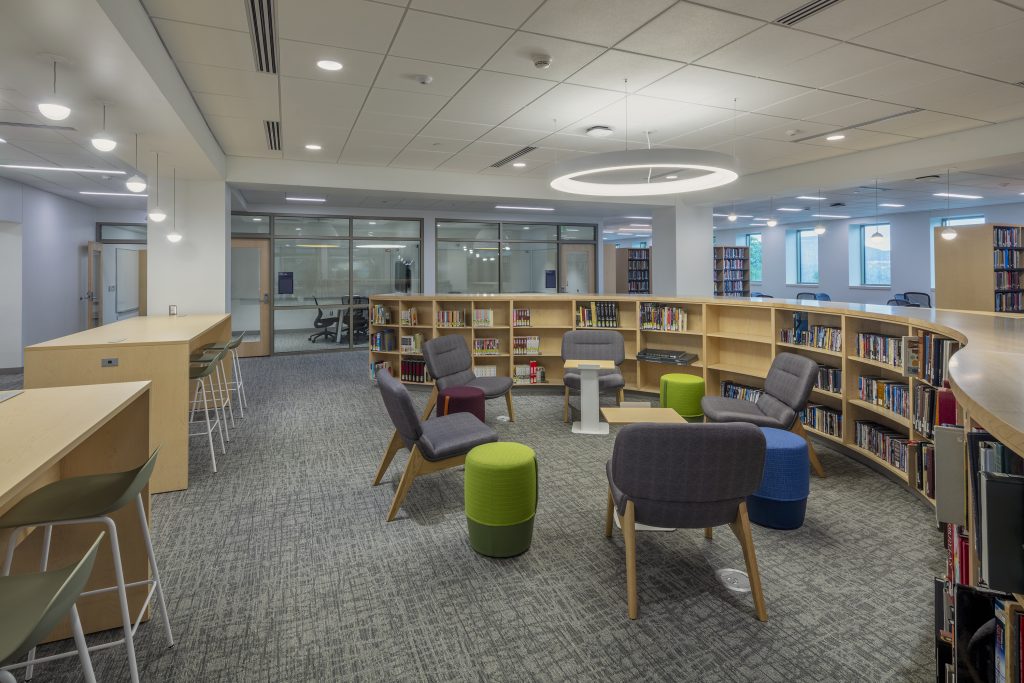 Various tables and seating address the diverse study preferences of the modern student. Low-curved shelving is directly in the library’s center with rotating collections and fun and comfortable lounge-style seating.