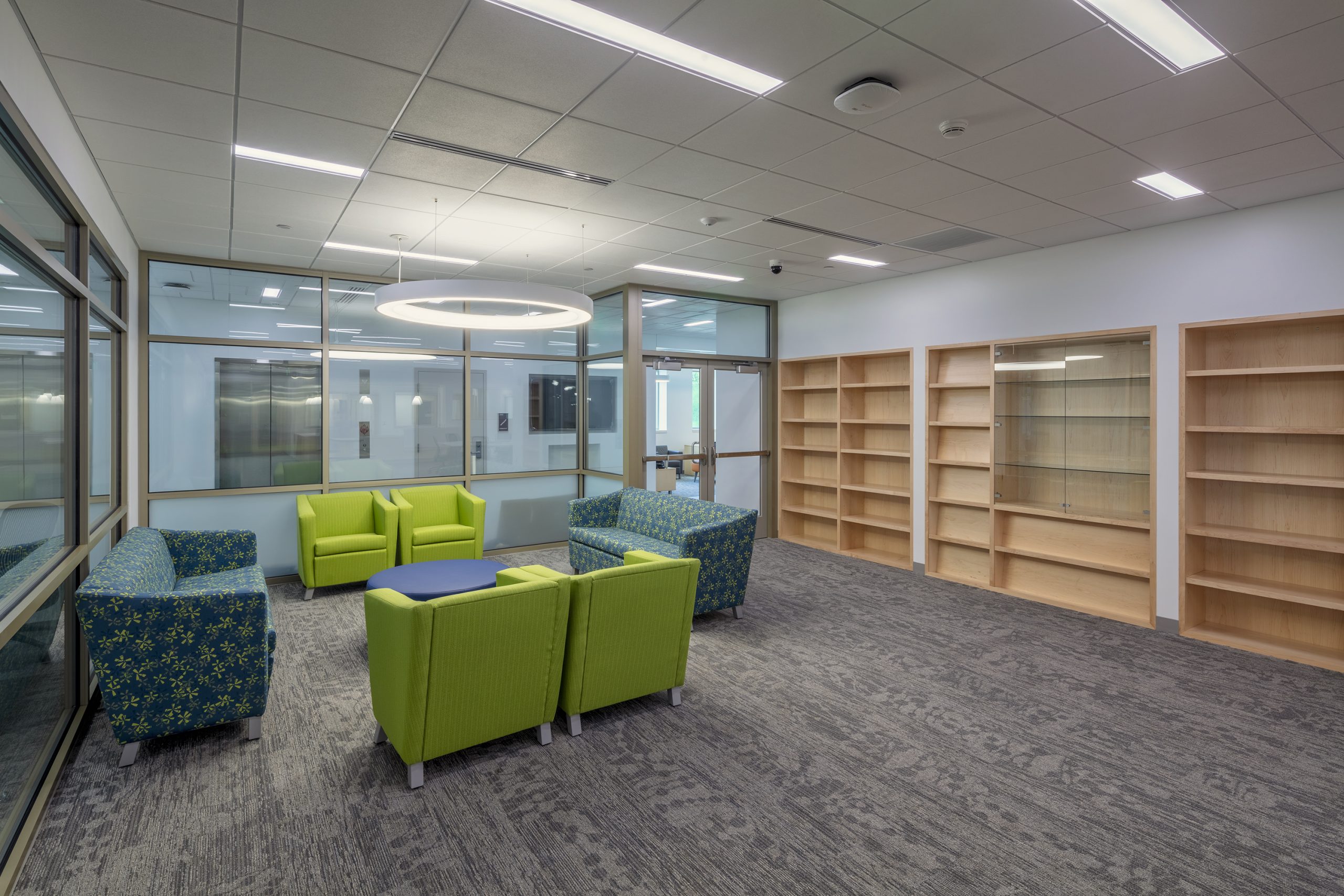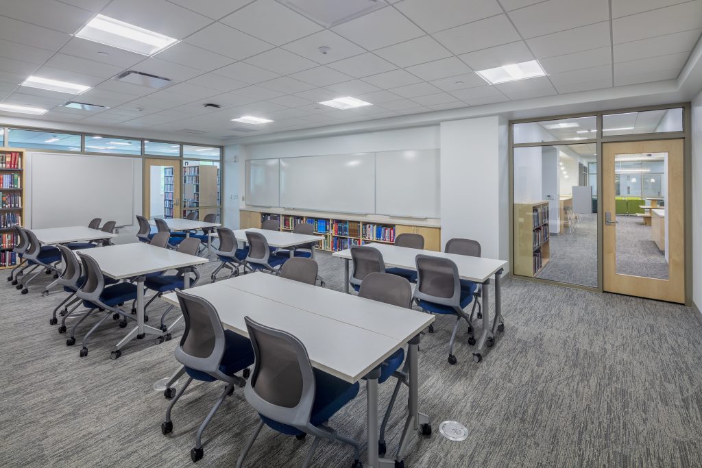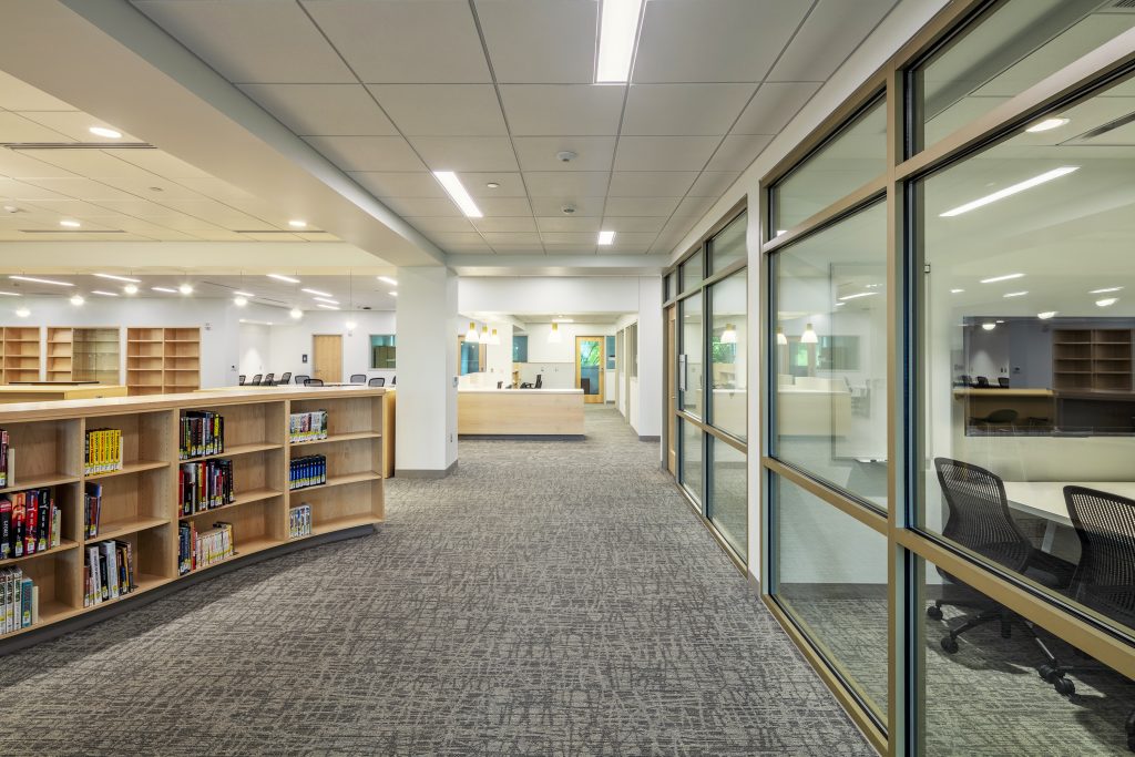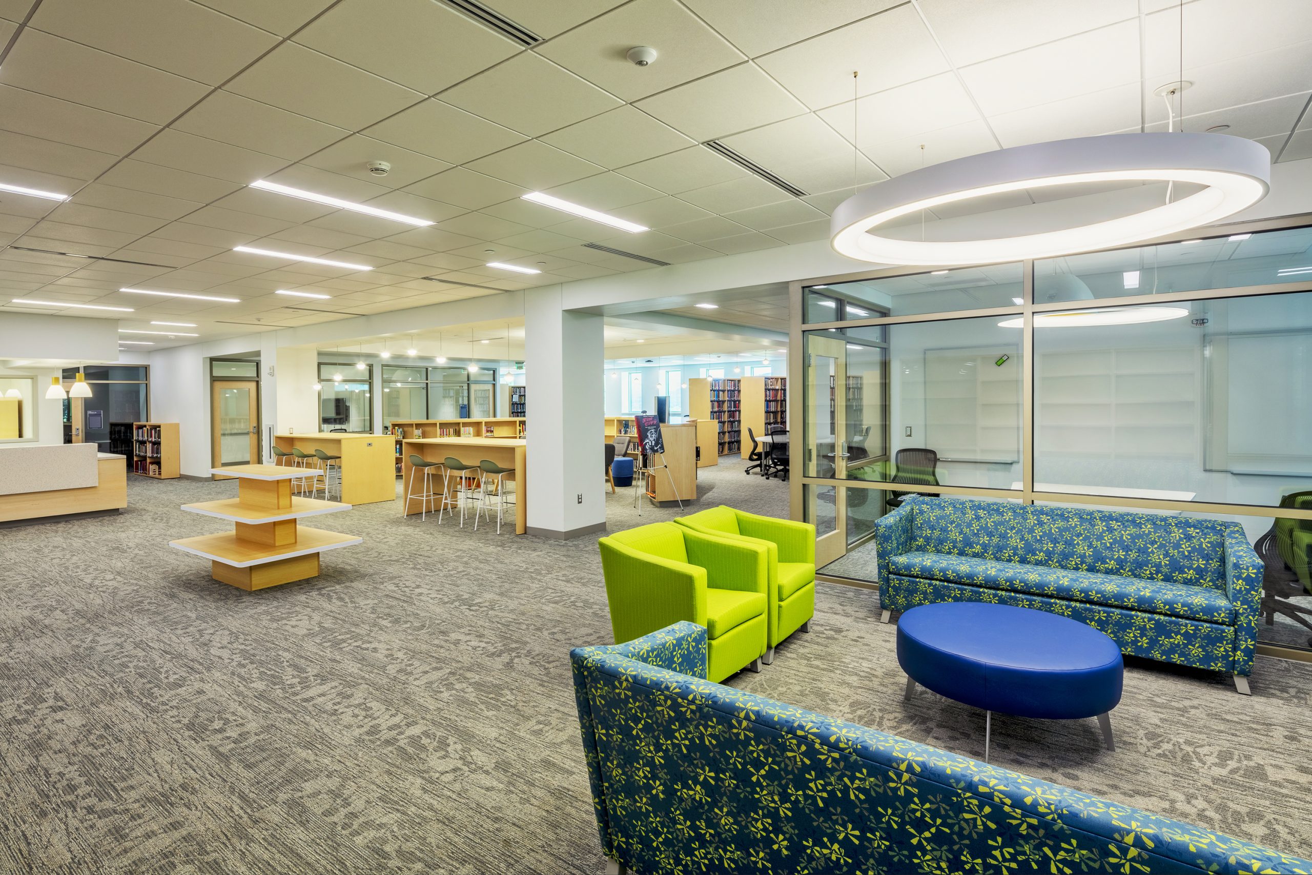 Various tables and seating address the diverse study preferences of the modern student. Low-curved shelving is directly in the library’s center with rotating collections and fun and comfortable lounge-style seating.