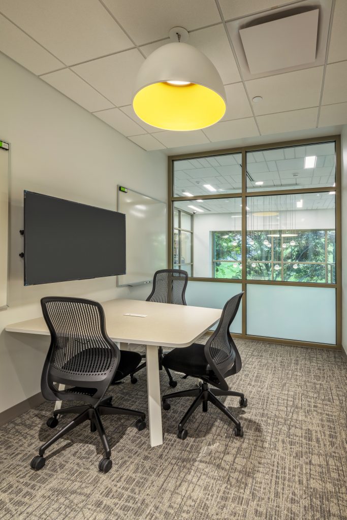 Small and medium study rooms flank the central space to the east and west. The study rooms are enclosed with glazed walls, allowing maximum transparency and natural light to radiate from the windows to the north into the larger space. Each room has a wall-mounted LCD monitor and ample marker boards.